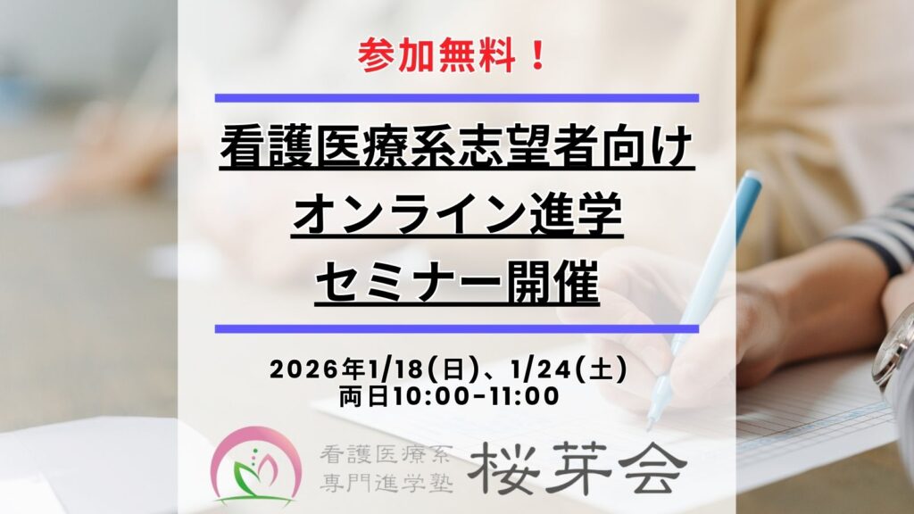 桜芽会では、2026年受験に向けた看護医療系大学進学セミナーをオンラインで開催いたします。