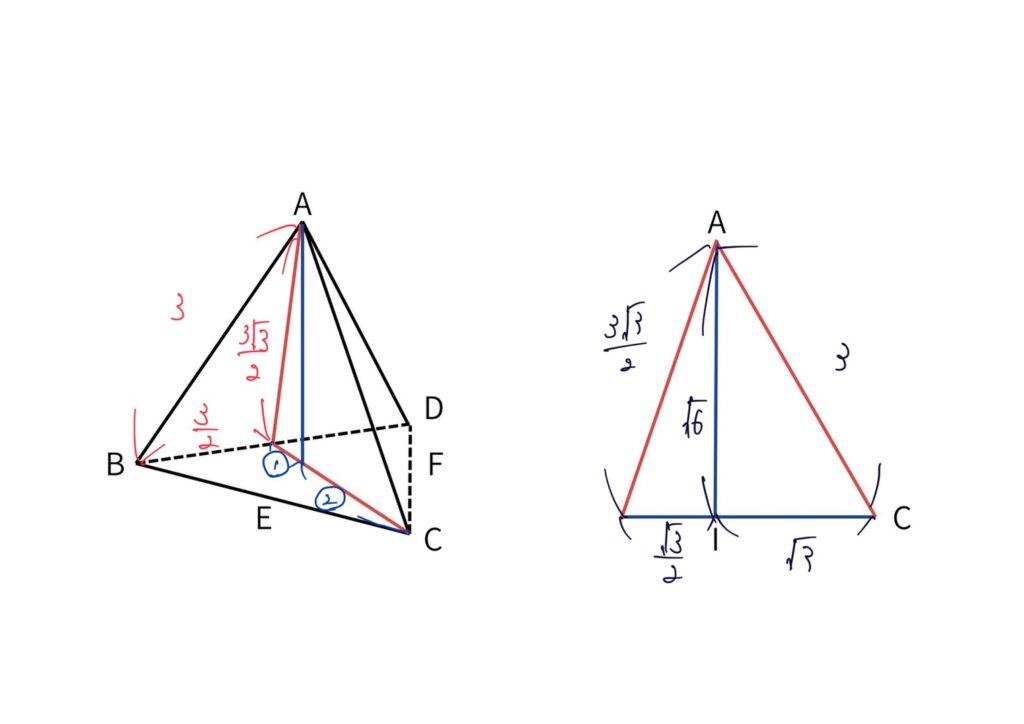 底面を△CEF(平面BCD上)とすると、高さは正四面体の高さ
